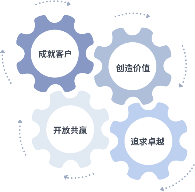 成就客户是一切决策的出发点,,,,创造价值是衡量所有工作的标准,,,追求卓越是我们做事做人的态度,,开放共赢是我们的格局也是最终的结果。。价值观的齿轮环环相扣,,,,推动着组织里的每个人不断向前。。。
