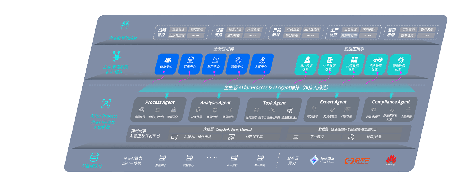 端到端的一站式AI工作空间深度融合了从企业战略规划到日常经营的全流程业务板块,,,,定向解决车企内部领域多、、、、部门多、、链条长、、、、场景碎片化等难题,,,,支持车企快速构建以AI为核心的生产力写作体系,,实现任务执行与AI能力的无缝集成与交互