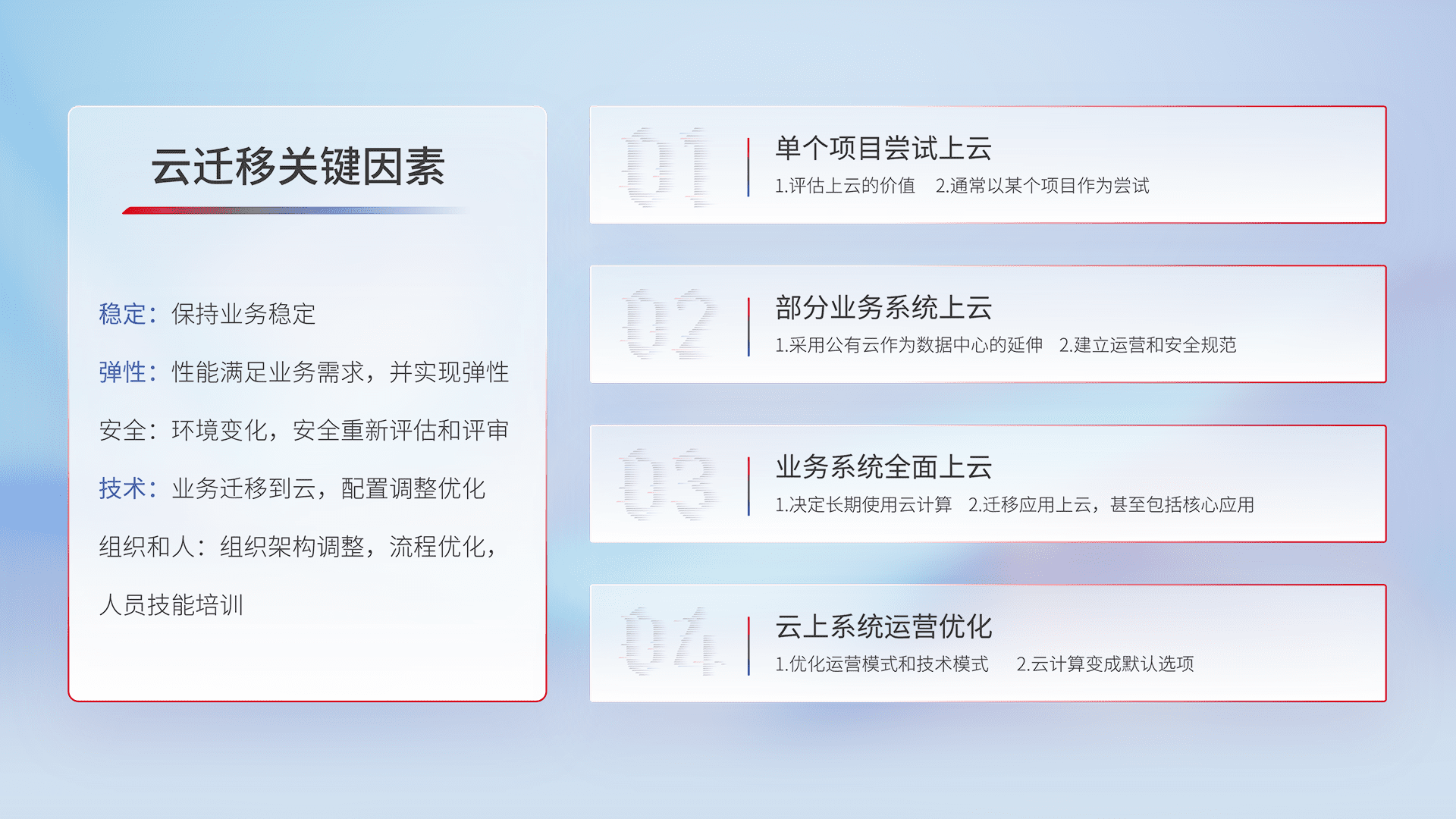 结合实际业务,,,从规划设计、、云平台选型、、、、云原生改造、、、数据迁移、、、、集成交付,,迁移全过程为客户识别最佳上云路径,,做好风险识别管理,,,设计网络架构、、身份权限、、、、安全审计合规、、、、操作审计、、、、日志审计、、、、监控告警策略、、多站点容灾设计等,,,,对云上基础设施进行整体规划,,提升IT治理水平,,以满足弹性、、、高可用、、、、高性能的需求。。。。
