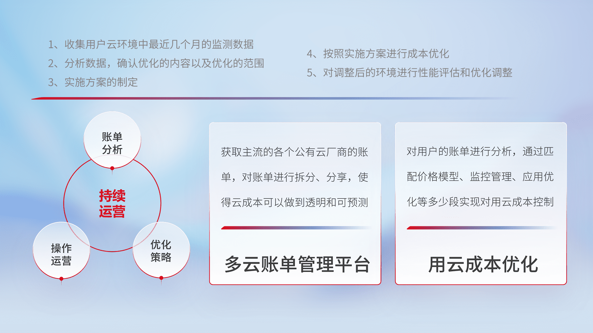通过灵活运用多种自动化迁移工具,,帮助企业用户实现业务和数据高效 、、、、稳定的上云迁移和云上迁移,,,采用自研多云纳管平台,,,以中立管理模式,,解决多组织、、多云、、多运维厂商的复杂关系的管理,,,,保证多云平台资源配置的一致性,,,实时掌控云资源运行数据,,,运用智能化工具分析云资源多云平台的管理服务,,透明化管理成本支出,,用云成本可预测、、、用云费用可优化、、、云资源配额有据可依。。。。