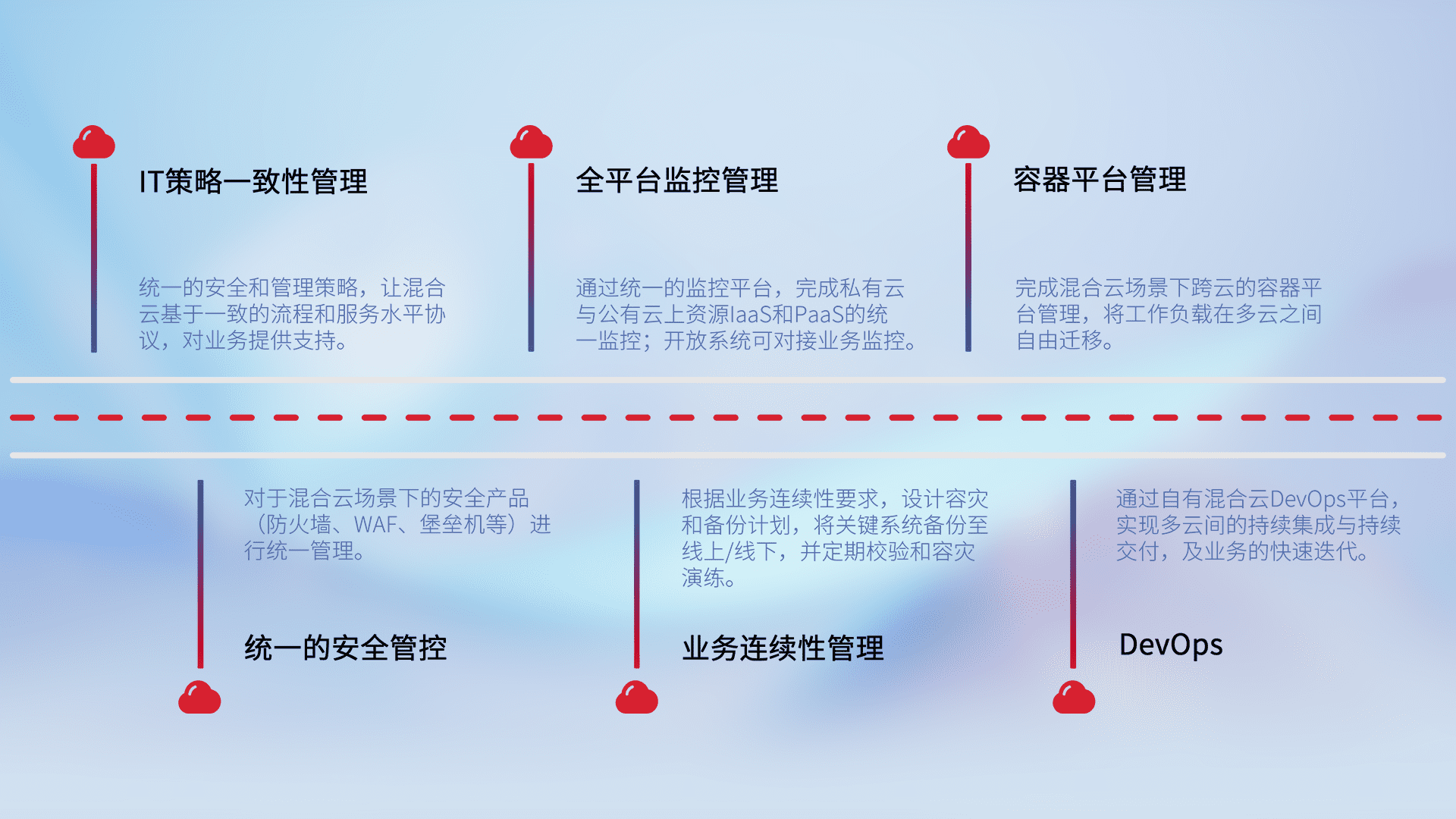 通过多云纳管,,,,以统一的资源数据模型把客户的云资源进行抽象和封装,,进而实现对多云资源的统一操作,,保障云资源管理的可靠性、、、、稳定性与可用性。。。量身定制化运维内容,,配置、、、开发运维、、、补丁管理、、备份、、监控、、、、认证和访问管理、、、审计和日常巡检等,,,保障在用云过程中的可靠度,,,,稳定度以及高可用率。。
